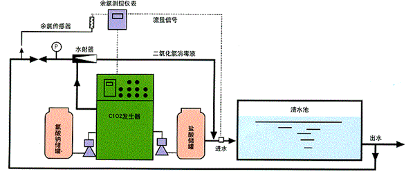 采用鹽酸與氯酸鈉定量注入到反應(yīng)釜內(nèi),反應(yīng)釜在加熱的情況下發(fā)生化學(xué)反應(yīng)生產(chǎn)二氧化氯與氯氣,再通過水射器吸入投加到消毒水體中。工藝采用負壓曝氣、正壓注入的技術(shù)來生產(chǎn)二氧化氯消毒液。